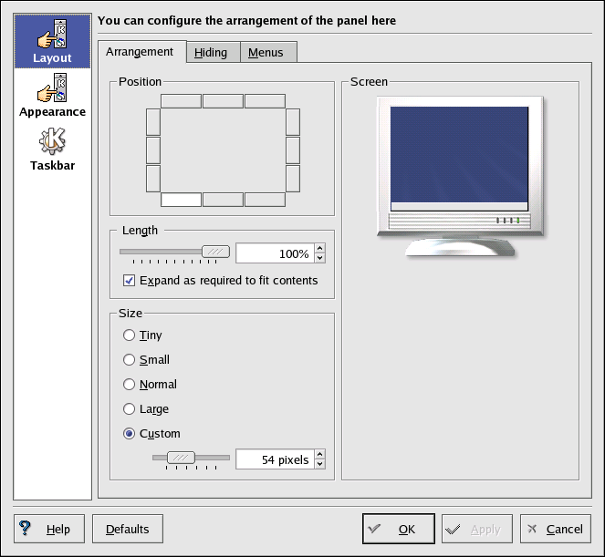Other tabs in Settings contain options to further customize your panel and taskbar. Click on Help for more information on these options.