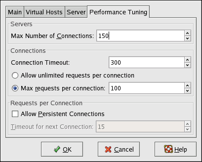 Click on the Performance Tuning tab to configure the maximum number of child server processes you want and to configure the Apache HTTP Server options for client connections. The default settings for these options are appropriate for most situations. Altering these settings may affect the overall performance of your Web server.