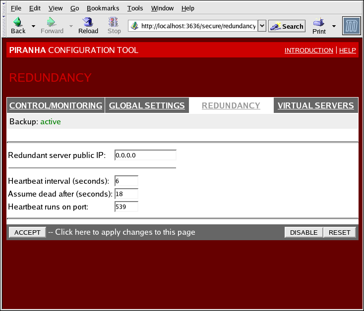 The REDUNDANCY panel allows you to configure of the backup LVS router node and set various heartbeat monitoring options.