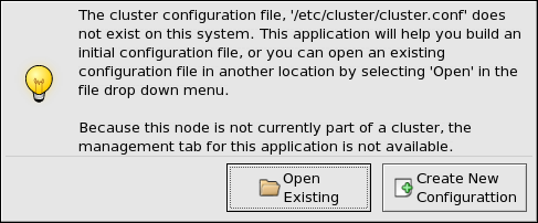 If this is the first time you have started the Cluster Configuration Tool, the program prompts you to either open an existing configuration or create a new one. Click Create New Configuration to start a new configuration file.